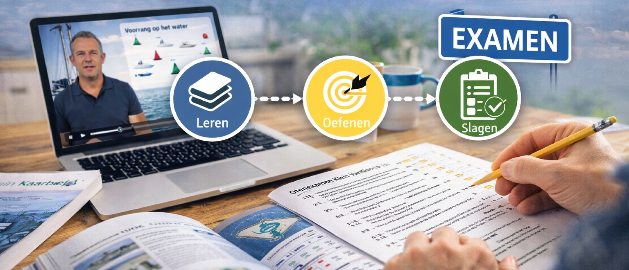 Bij Vaarschool Het Kompas vind je een volledig oefenpakket met unieke slagingsgarantie als je alle vragen twee keer maakt. Bekijk het complete stappenplan naar je vaarbewijs voor meer info over oefenen, wat je precies kunt verwachten op het examen en wat je moet doen om je slagingskans te maximaliseren.